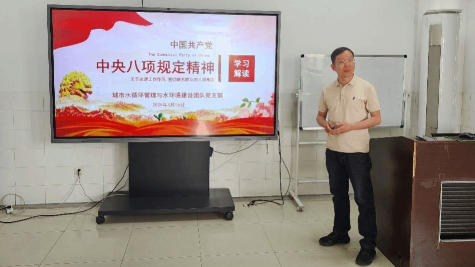 2025 年 4 月 16 日,城市水循环管理与水环境建设团队党支部组织全体党员开展 “学习中央八项规定精神,改进工作作风、密切联系群众”专题党课。支部紧扣“学思践悟、实干笃行”主线,通过深度解读政策内涵、结合行业特点谋划落实举措,以全国党建工作样板支部的高标准推进党建与业务深度融合。本次专题学习由支部纪律委员胡以松领学,全体党员认真观看幻灯片,并在会上展开热烈讨论,分享学习心得和体会。