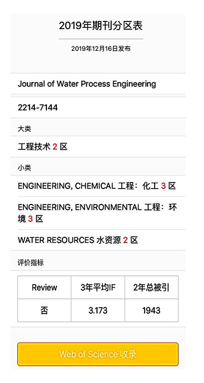 Journal of Water Process Engineering进入中科院JCR工程技术2区