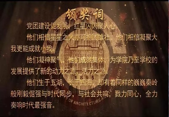 莅临晚会和颁奖典礼的领导嘉宾有西安建筑科技大学校党委副书记张志昌老师,学工部部长、学生处处长刘晓武老师,研工部部长张煜老师,审计处处长马毅老师,校团委书记申健老师,校招标采购办公室主任迟志武老师,体育学院党总支书记吕永安老师,校纪委副处级纪检员陈林波老师,学工部副部长、学生处副处长范鹏飞老师,学工部副部长、学生处副处长张振龙老师,研工部副部长蒋正老师,党委统战部副部长郝纪超老师,创新创业教育办公室副主任张爱辉老师,校工程指挥部办公室副主任王平老师,发展规划处副处级研究员王晓理老师,安德学院党支部书记、副院长刘言正老师;参加晚会的学院领导和老师有yl23455永利官网党委书记王劲松老师,yl23455永利官网院长任勇翔老师,yl23455永利官网党委副书记、副院长郑成华老师,yl23455永利官网副院长刘立忠老师,yl23455永利官网副院长金鹏康老师,环境工程重点实验室副主任袁林江老师,国家级环境类教学实验中心主任葛碧洲老师,环境工程教研室主任韩芸老师,环境科学教研室党支部书记张崇淼老师,环境科学教研室主任吴蔓莉老师,学院党政办马耀星老师,学院教学秘书朱陆莉老师,教学办仵红恰老师,学院学工办主任冯永宁老师,参加晚会的还有兄弟学院学工办和团委负责老师、辅导员和2018、2019级各班班主任老师。