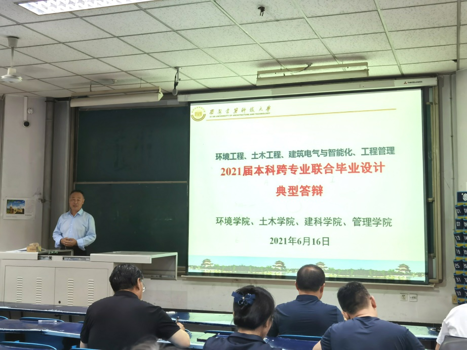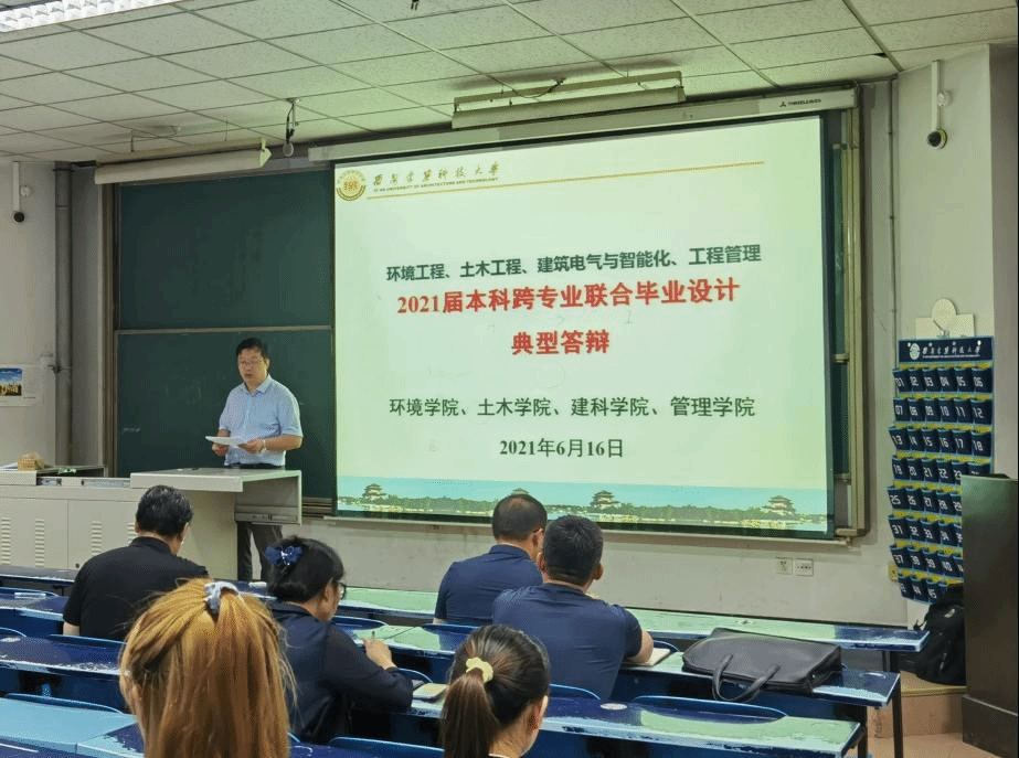 6月16日上午,西安建筑科技大学环境工程、土木工程、建筑电气与智能化、工程管理2021届本科跨专业联合毕业设计(论文)答辩会在雁塔校区南阶206顺利举行。西安建筑科技大学本科生跨专业联合毕业设计,在学校教务处的高度认可和支持下,经过yl23455永利官网、土木学院、建科学院和管理学院的师生们共同努力,目前已经连续有效实施三年。这三年来,参与教师进行不断优化完善,逐年扩大专业配比,更新设计题目,优化设计内容。2021年(今年)在设计选题方向上又有新的突破,在污水处理工程设计方向的基础上,增加了固体废物处理工程设计方向,增加了新的教师参与。跨专业联合毕业设计是采用设计院运行模式,培养学生在多学科背景下解决复杂工程问题的能力。通过跨学科-多专业的深度交流,使学生掌握设计过程中不同专业沟通、交底的程序方法,提高学生工程认知、分析、解决、表达和交流能力,实现了多专业背景协同解决复杂环境工程问题的能力培养,构建了工程教育创新型实践模式。答辩会分两个阶段进行。
