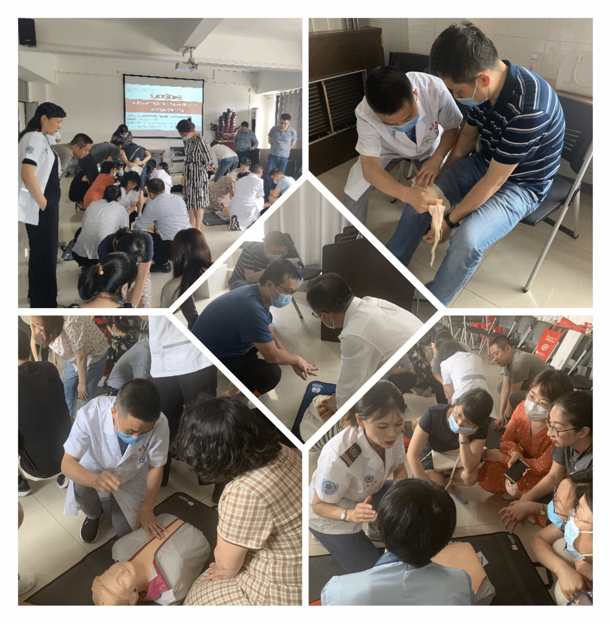 培训的第二部分为急救实操演练。陕西省急救中心的医生和护士采用演示、讲解和答疑等形式,现场指导师生进行了心肺复苏、AED使用、癫痫发作、骨折夹板固定和外伤包扎等急救技能的演练。