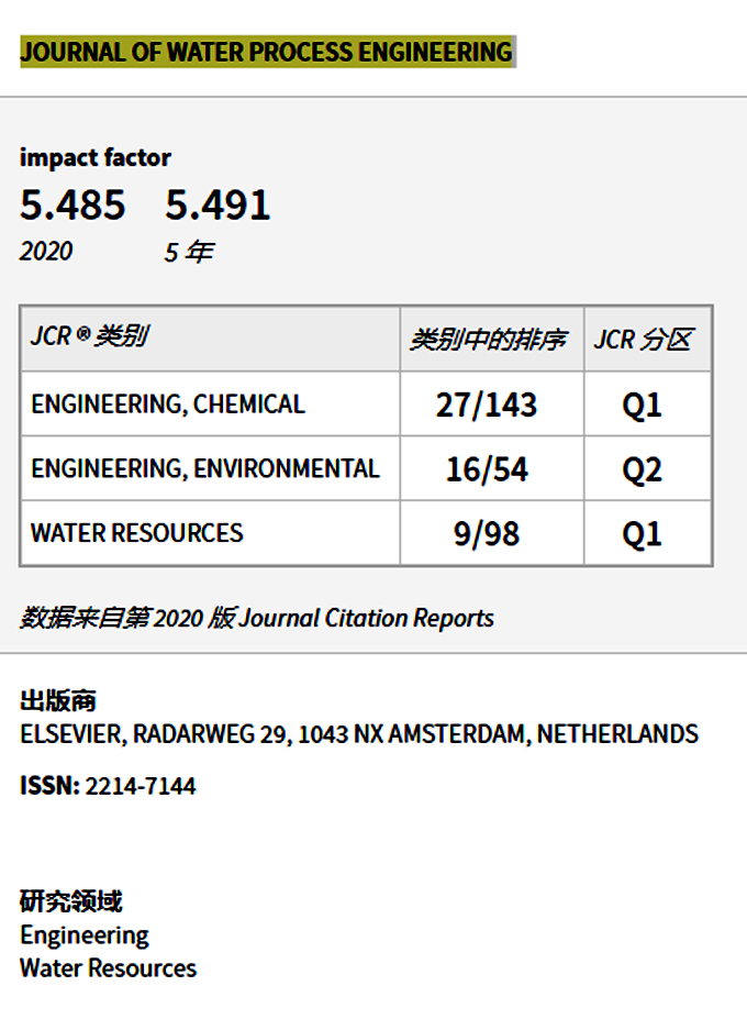 据科睿唯安最新发布的2020年度JCR期刊引证报告,我校王晓昌教授担任共同主编的Elsevier期刊—Journal of Water Process Engineering(JWPE)影响因子升高到5.485,在98种水资源类期刊中位列第9位,进入JCR Q1区;在143种工程化学类期刊中位列第27位,也进入JCR Q1区;在54种环境工程类期刊中位列第16位,仍为JCR Q2区。