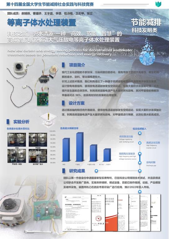 作品简介:印染废水排放量逐年上升,造成的环境问题日趋恶化,而现有传统工艺对于高浓度有机废水处理效果不佳,因此,团队提出一种新型低温等离子体水处理装置,旨在解决印染废水难以处理的问题。