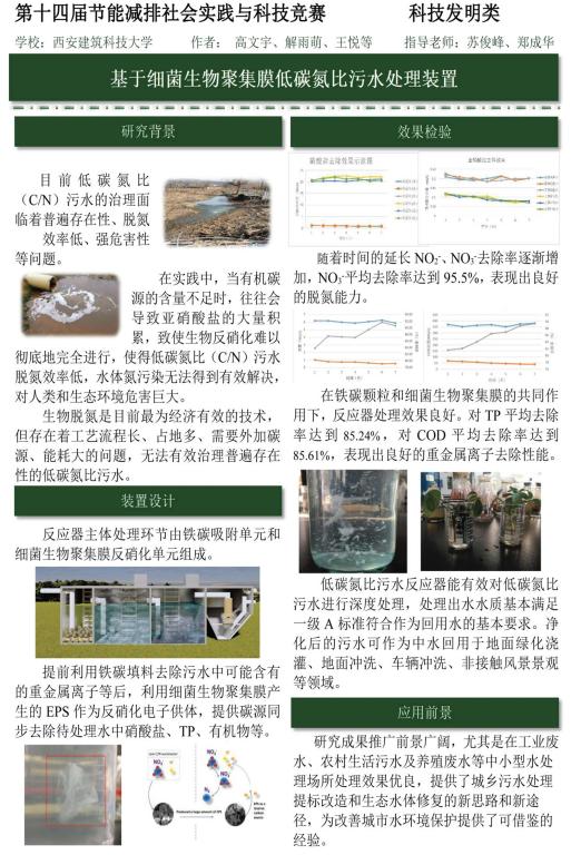 作品简介:人类饮食结构改变,生活污水氮含量上升,市政管道交叉污染和稀释作用等原因导致了我国污水普遍碳源不足,脱氮过程反硝化环节难以高效进行。出水中的氮磷超标会对人类的身体健康和生态环境造成巨大危害。团队实地走访多家西安市污水处理厂发现:如何实现水质增效与节能减排的双赢已然是污水提标改造工作的重中之重。成员基于细菌生物聚集膜提供了一种处理低碳氮比污水的装置,通过铁碳的物理吸附作用和生成化学沉淀去除水中的总磷和悬浮物;充分利用细菌生物聚集膜高效的脱氮性能和工艺的独特优势,在装置内进行连续高效的反硝化脱氮反应,将低品质尾水提升为“零有害物积累”的高品质再生水。在生物脱氮效率达到95%的同时,耗电量降低43%,可减少50%~100%的传统碳源投入。研究成果在实际场景中有所应用,尤其是在污水厂提标改造、农村生活污水水处理场所处理效果优良,推广前景大。本项目已申请国家发明专利3项,2项进入实质审查阶段,并以本科生为第一作者投稿SCI期刊,并完成实物模型1套。
