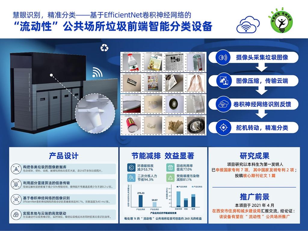 作品简介:垃圾前端分类的缺失是导致后续处理困难、资源回收率低下的重要原因。公共场所垃圾产量逐年增长且回收处置不完善,严重影响了我国生态环境和城市形象。为解决公共场所垃圾前端分类问题,团队基于EfficientNet卷积神经网络和超分重建(RAISR)算法等技术,创造性地研发了一款垃圾全自动智能分类设备。本设备主要包括图像采集、无线通信、智能识别、中央处理和机械分拨五大模块。通过图像数据库和云端互联,可高效识别金属、纸张、玻璃、塑料等多种垃圾,综合识别准确率高达90.7%,相较于传统的InceptionV3提高了15.8%;利用RAISR算法对垃圾图像压缩重建,相较未使用算法,能在保证解析度的前提下减少50.0%的传输时间,每张图片传输仅需0.2 s,大幅提升垃圾识别和分类投放效率,特别适用于景区、商场、地铁站、酒店大堂等人流量较大、垃圾单次投放占比高且种类较少的“流动性”公共场所,在国内市场上具有首创性。与传统垃圾处理方式相比,本设备应用后能大幅降低人工成本,提高垃圾资源化水平,显著减少污染物排放量。在整个垃圾处理生命周期内减少焚烧填埋污染物81.1%,减少环境碳排放量53.7%。每处理1 t“流动性”公共场所垃圾可新增约260元收益;而一个智能分类垃圾桶的成本仅为1250元,投资收益率高,拥有广阔的市场前景和良好的推广价值。本项目的技术和设备已经通过中国科学院查新鉴定,以本科生为第一发明人申报国家发明专利2项,实用新型专利3项(授权1项),授权外观设计专利2项。投稿核心期刊论文1篇。设备在“流动性”公共场所应用的可行性已得到西安市住建局的高度认可,团队已完成与陕西生态环境规划设计院有限公司、陕西省食品药品检验研究院的联合项目申报,正在进行设备的产业化开发。