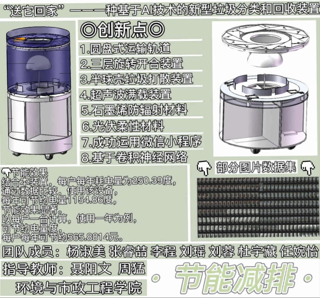 作品简介:为了加强危险废物收集处理,有序推进城镇生活垃圾分类工作。为实施可持续发展贡献一份力量,同时顺应科技创新的时代潮流,故我们致力于设计出一款实现垃圾分类和回收的装置。本装置是一款基于AI技术的以机器视觉系统为智能视觉识别系统的新型智能识别分类与回收垃圾桶,通过对垃圾桶功能的增加和优化,实现了智能化垃圾识别分类和回收。装置主要分为四个部分:自动感应投放口部分分流识别与分类部分、垃圾桶部分和电池与控制部分。创新的应用了圆盘式运输轨道,除此之外添加了太阳能转化、气味隔绝分类显示满载报警等功能。提高了普遍化垃圾分类和回收的效率。随着政策的推动、和经济的增长、消费群体变革、科技发展和环保观念深入人心的趋势发展,垃圾桶行业在未来将会持续不断的发展壮大。2019年垃圾桶行业市场规模达到2500亿元,同比增长了18.6%。由于国内及国外供需情况短期难以达到平衡,国内垃圾桶行业市场需求旺盛。“联联网+”应用在垃圾桶领域,为垃圾桶行业带来新的发展空间。