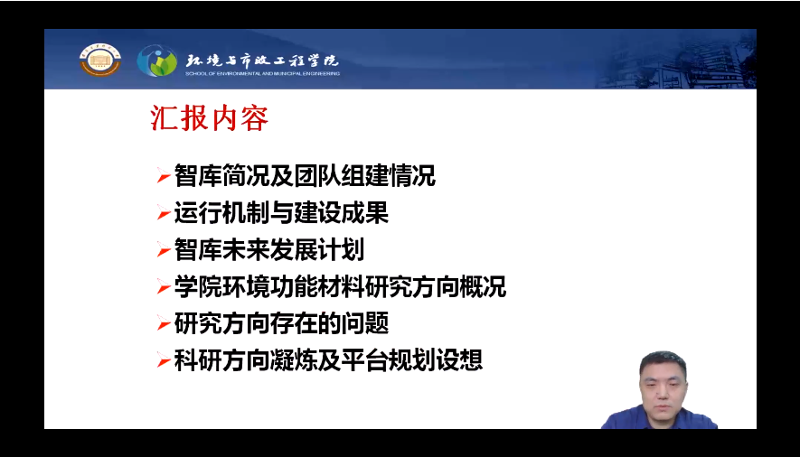吴鹍教授就团队组建情况、运行机制、建设成果和整改计划等几个方面汇报了智库的建设情况,并从环境功能材料研究方向的人员分布、工作进展、面临问题和发展思路等角度阐述了智库的发展规划及设想。