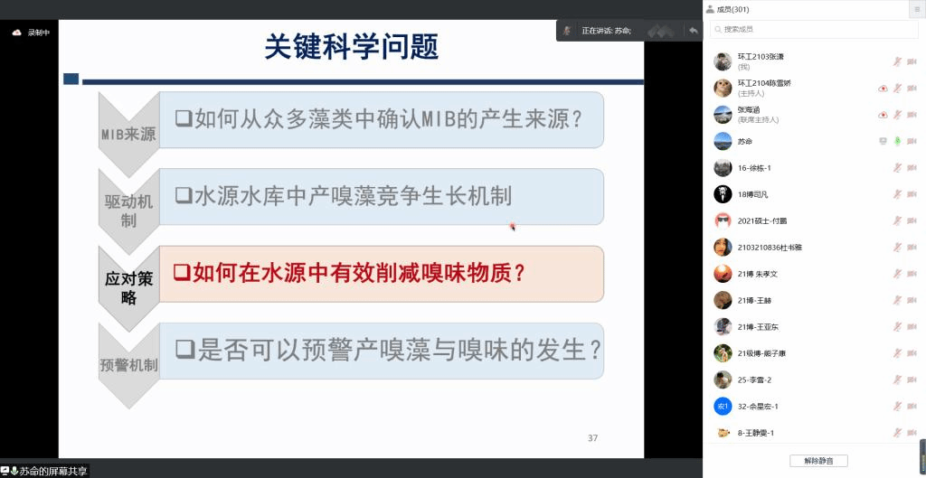 第二期特邀中国科学院生态环境研究中心副研究员苏命老师担任主讲嘉宾。苏老师以《水源产嗅藻识别与控制策略》为题,首先以遍布全球的饮用水嗅味问题为背景,指出MIB主导的土霉味已成为普遍存在的饮用水水质问题;接着他以上海青草沙水库为例,通过建立针对产嗅藻生态位特征的原位调控技术,解决了MIB来源、产嗅藻竞争生长机制、削减嗅味物质、预警产嗅藻与嗅味产生等问题。最后,yl23455永利官网副院长张海涵教授进行总结,并强调理论研究的终极目标是要落地,将理论转化成生产力、技术来解决一些实际难题,才是研究的根本目的。