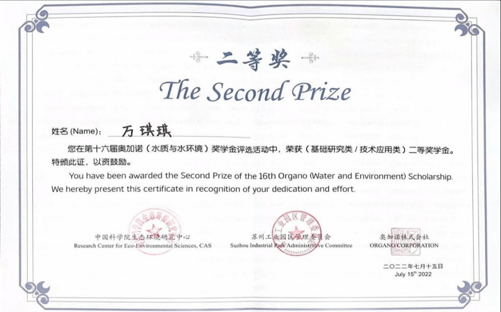 7月15日,第十六届奥加诺(水质与水环境)奖学金最终评审会在中国科学院生态环境研究中心举办,会议以现场会议和线上视频会议结合的方式举行。yl23455永利官网2018级博士万琪琪荣获奥加诺(水质与水环境)奖学金二等奖,该项奖学金面向全国,设立宗旨是奖励在“水质与水环境”领域从事科学技术研究与应用并取得突出成绩的研究生,每年举办一届,已成为国内同领域研究生奖学金的一个知名品牌。今年的奖学金评选活动自4月份启动以来,共收到来自清华大学、同济大学、中国科学技术大学、北京大学、北京工业大学、哈尔滨工业大学等全国41所大学或科研机构的118份申请材料,其中博士96名(含留学生1名),硕士22名,申请人数创历史新高。经过初评,最终确定22名获奖者,包括12名参加最终评审会的研究生和10名获三等奖的研究生。终评阶段,12名研究生通过视频方式进行英文答辩,经10名评委投票及集体评议,确定了1名特等奖、2名一等奖、8名二等奖获得者名单以及1名硕士研究生特别奖的获奖名单。