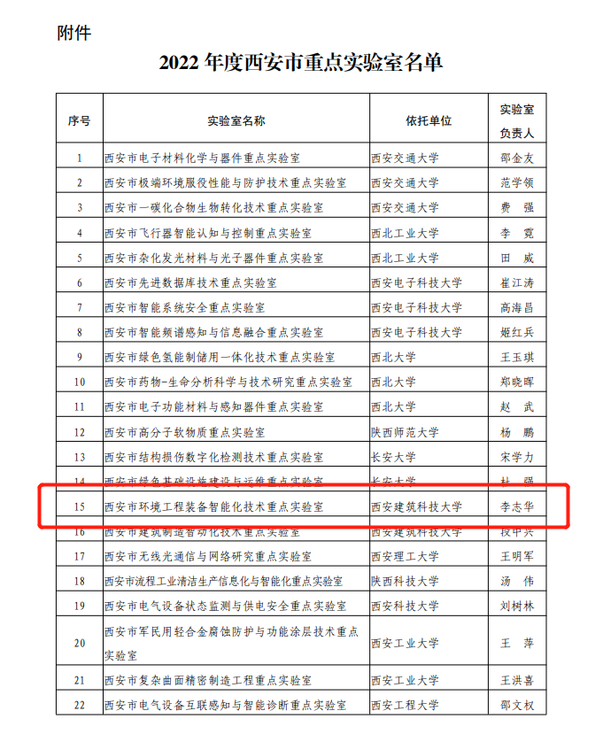 2022年12月13日,西安市科学技术局公布2022年西安市重点实验室认定名单,西安建筑科技大学李志华教授负责的《西安市环境工程装备智能化技术重点实验室》通过认定。