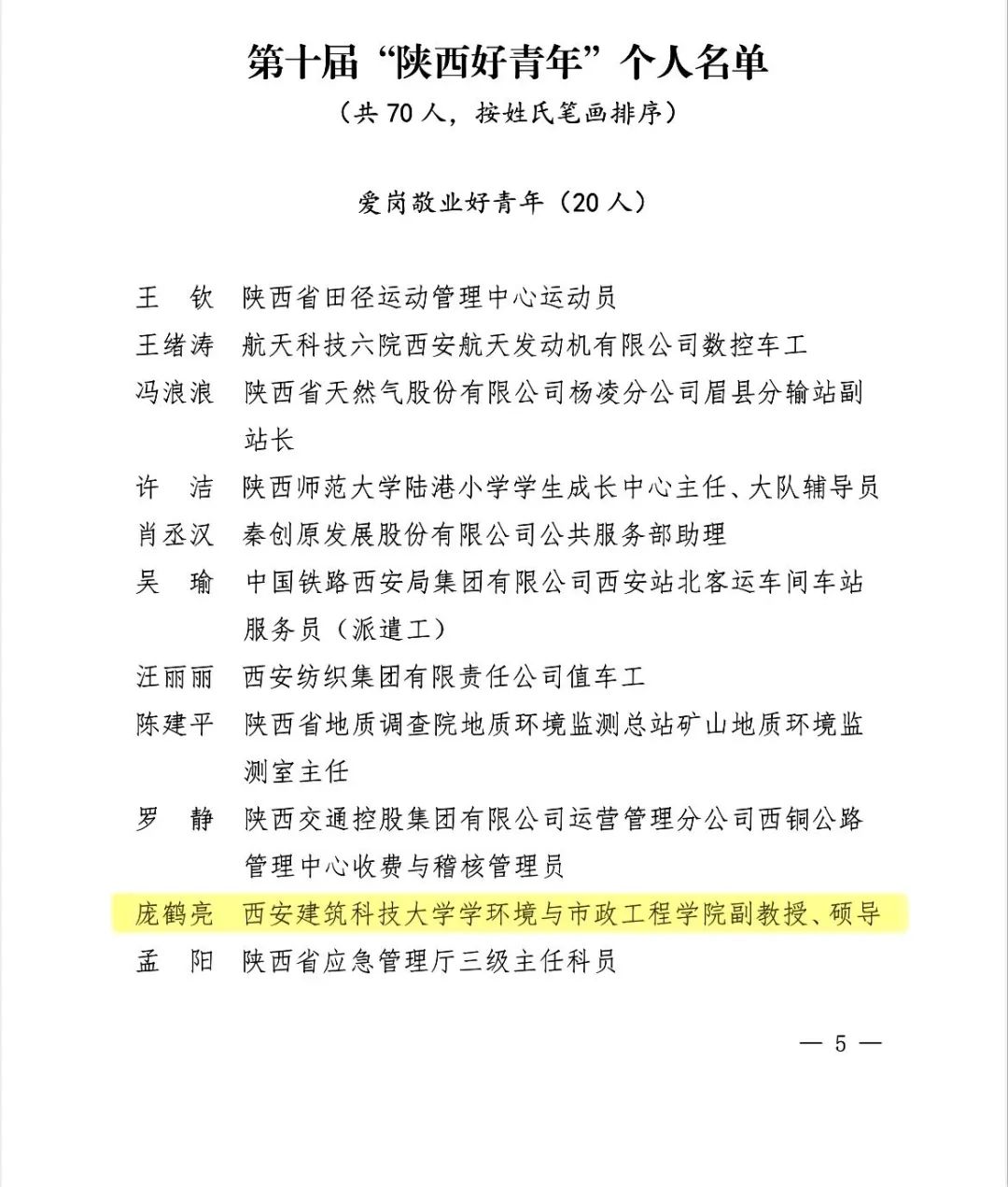 近日由团省委联合省委宣传部、省委政法委、省委网信办等单位共同举办的第十届“‘中国梦·青年志’——寻找身边的陕西好青年”主题活动评审结果揭晓。我院副教授、硕导庞鹤亮荣获“爱岗敬业好青年”个人荣誉。