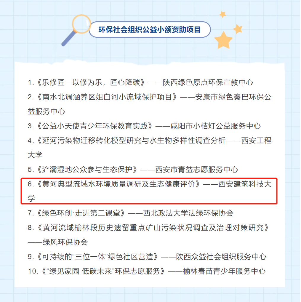 经过宣传发动、组织推荐、专家评审等环节,我院《黄河典型流域水环境质量调研及生态健康评价》获评为2023年陕西省环保社会组织公益项目小额资助项目。